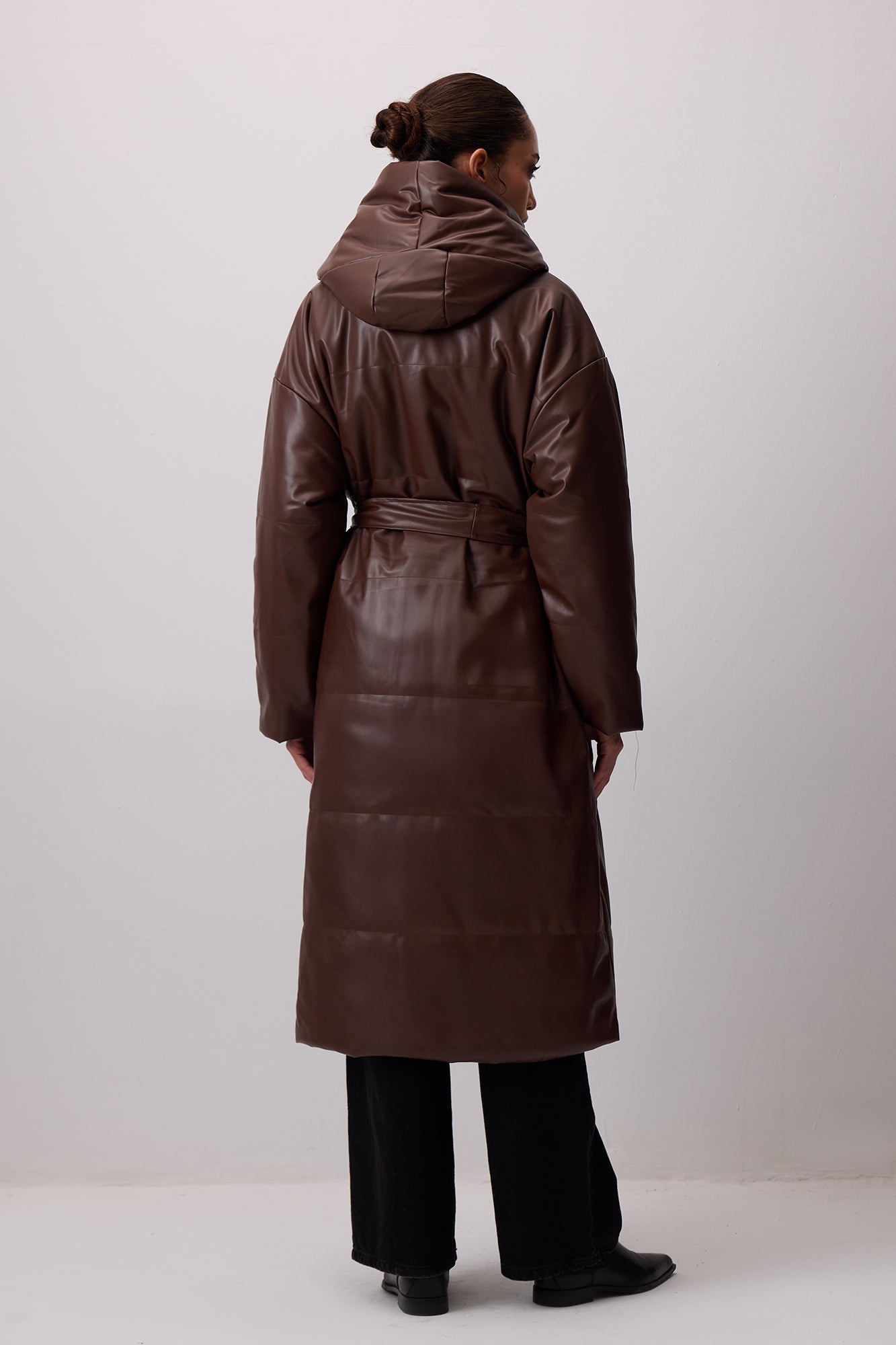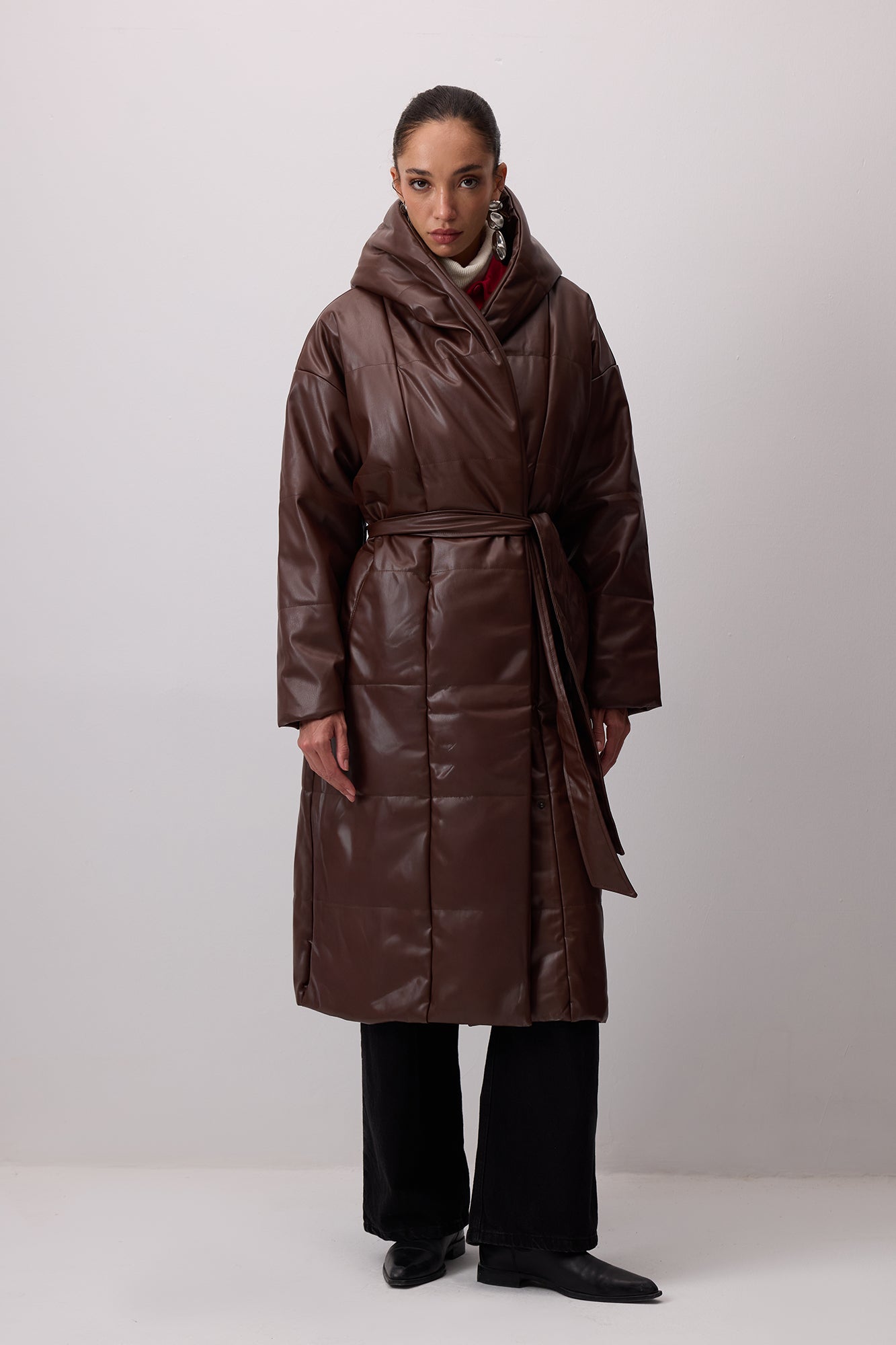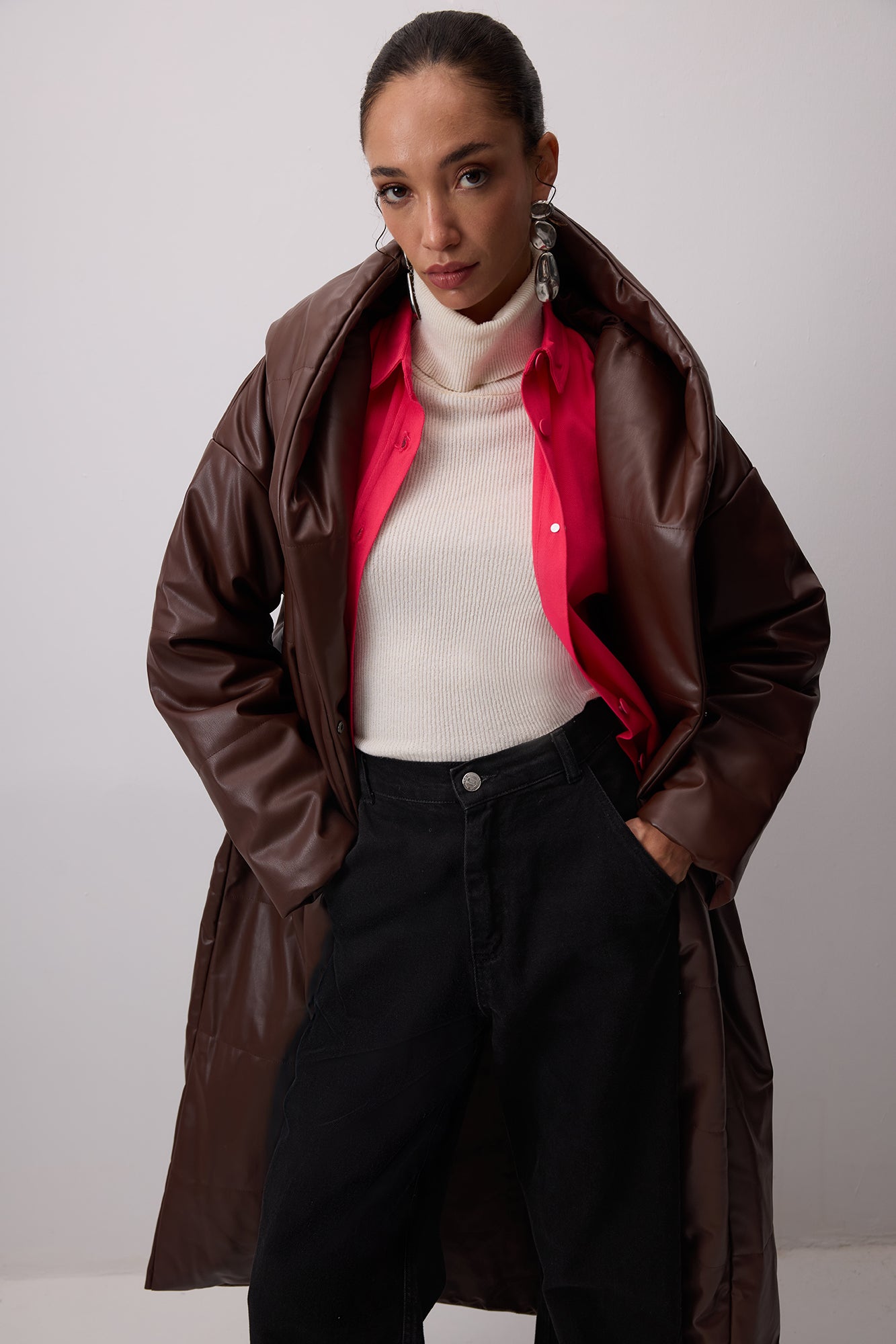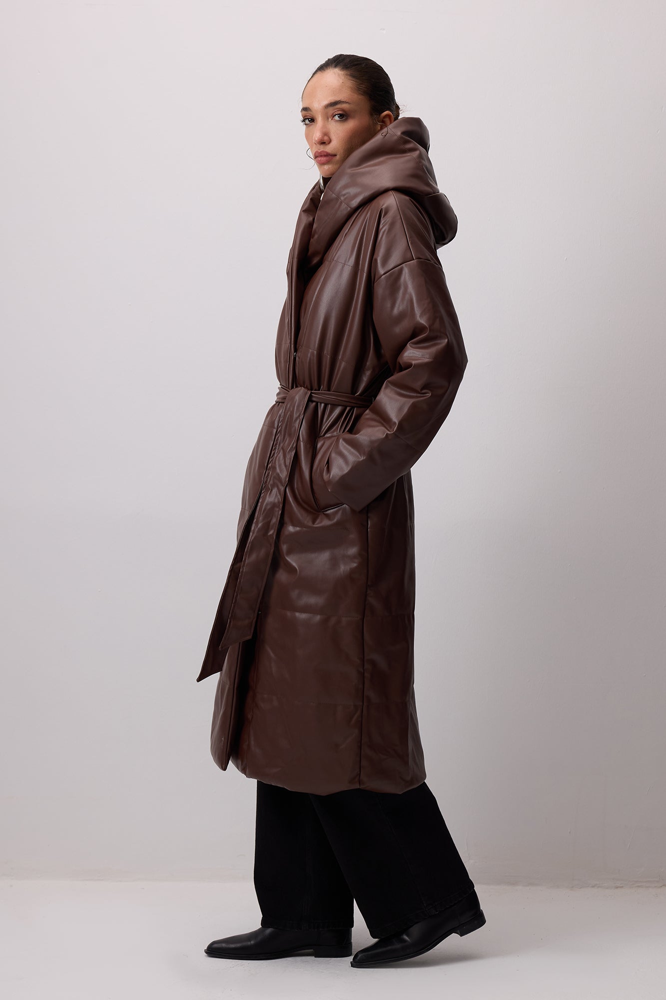 KAPÜŞONLU MAXİ VEGAN DERİ MONT