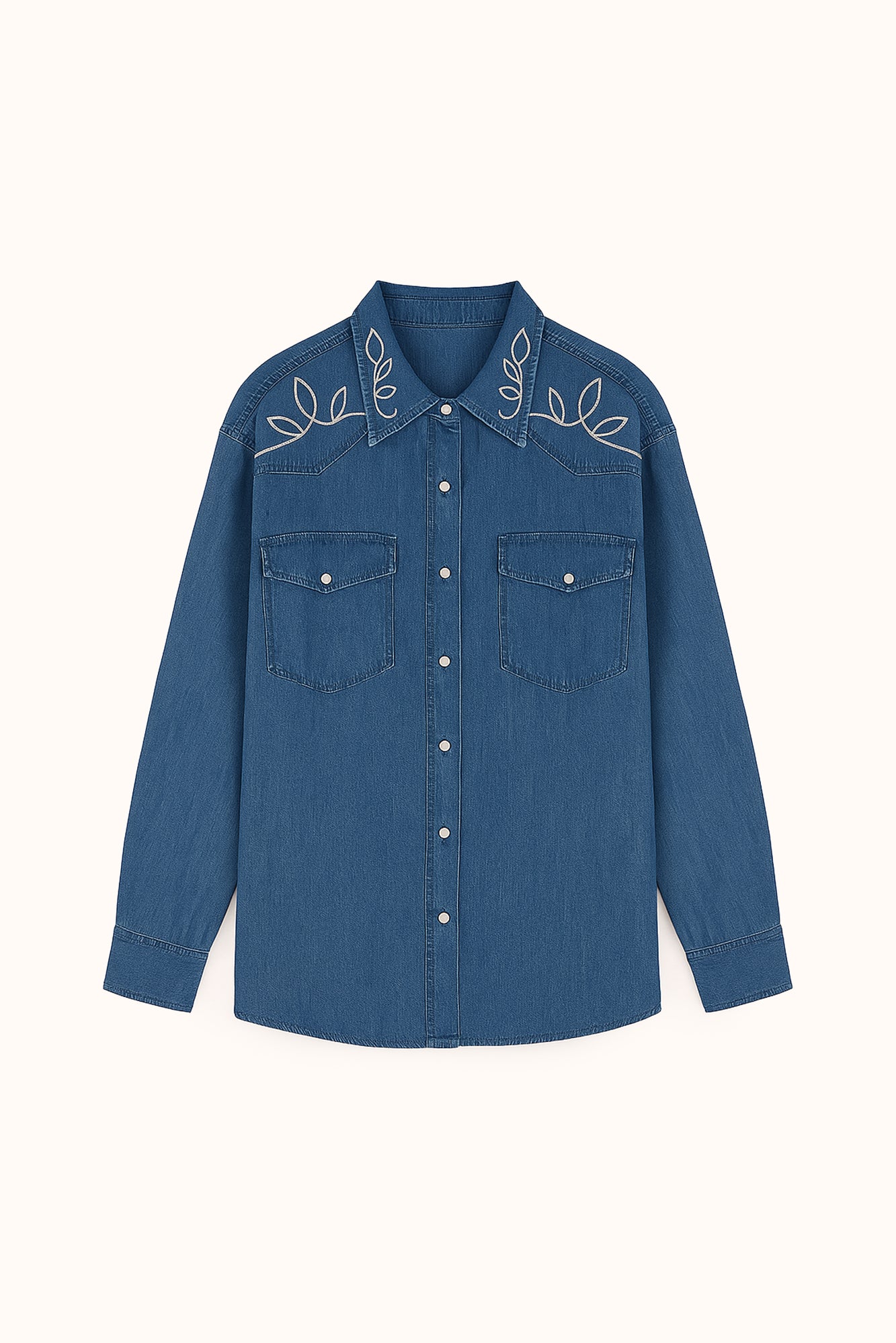 OMUZ NAKIŞLI DENİM EFEKTLİ GÖMLEK
