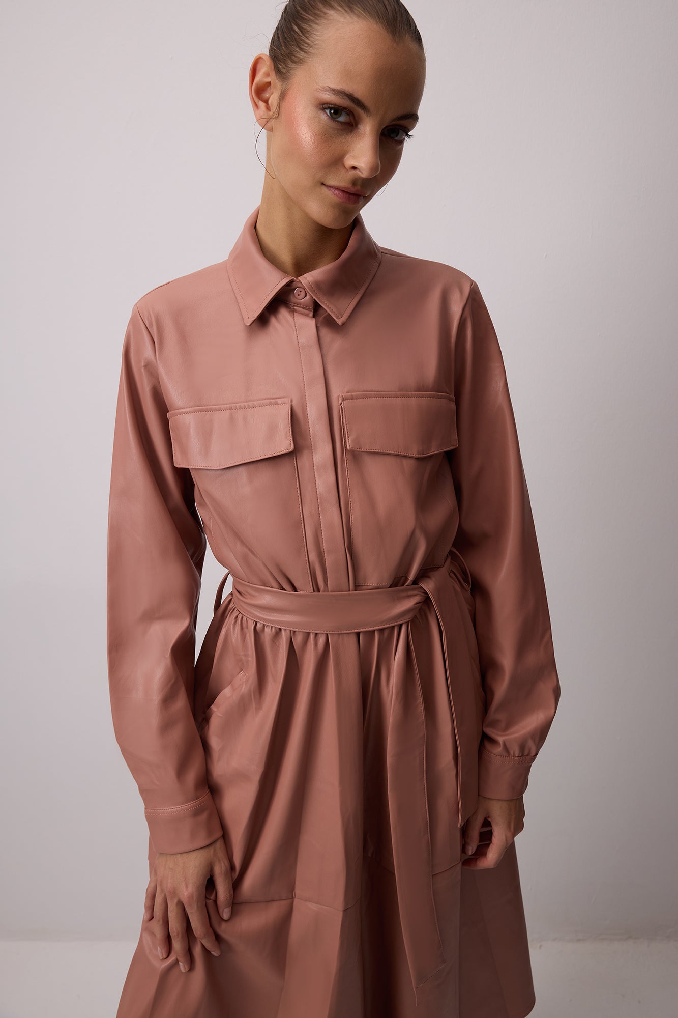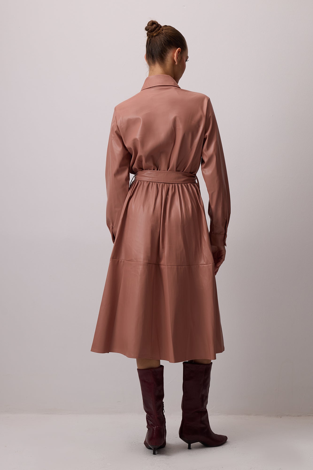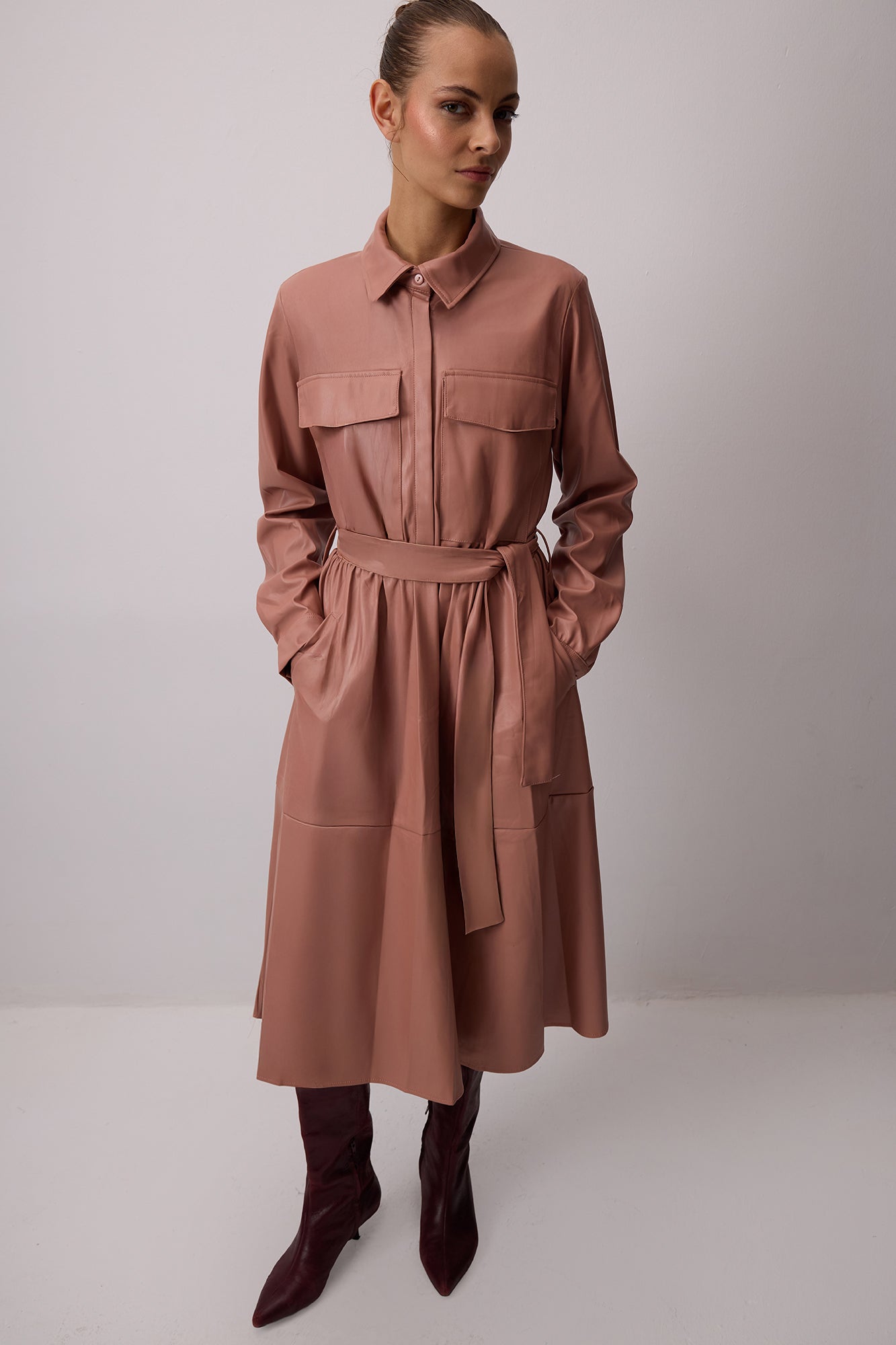 ÖNÜ CEPLİ UZUN DERİ ELBİSE