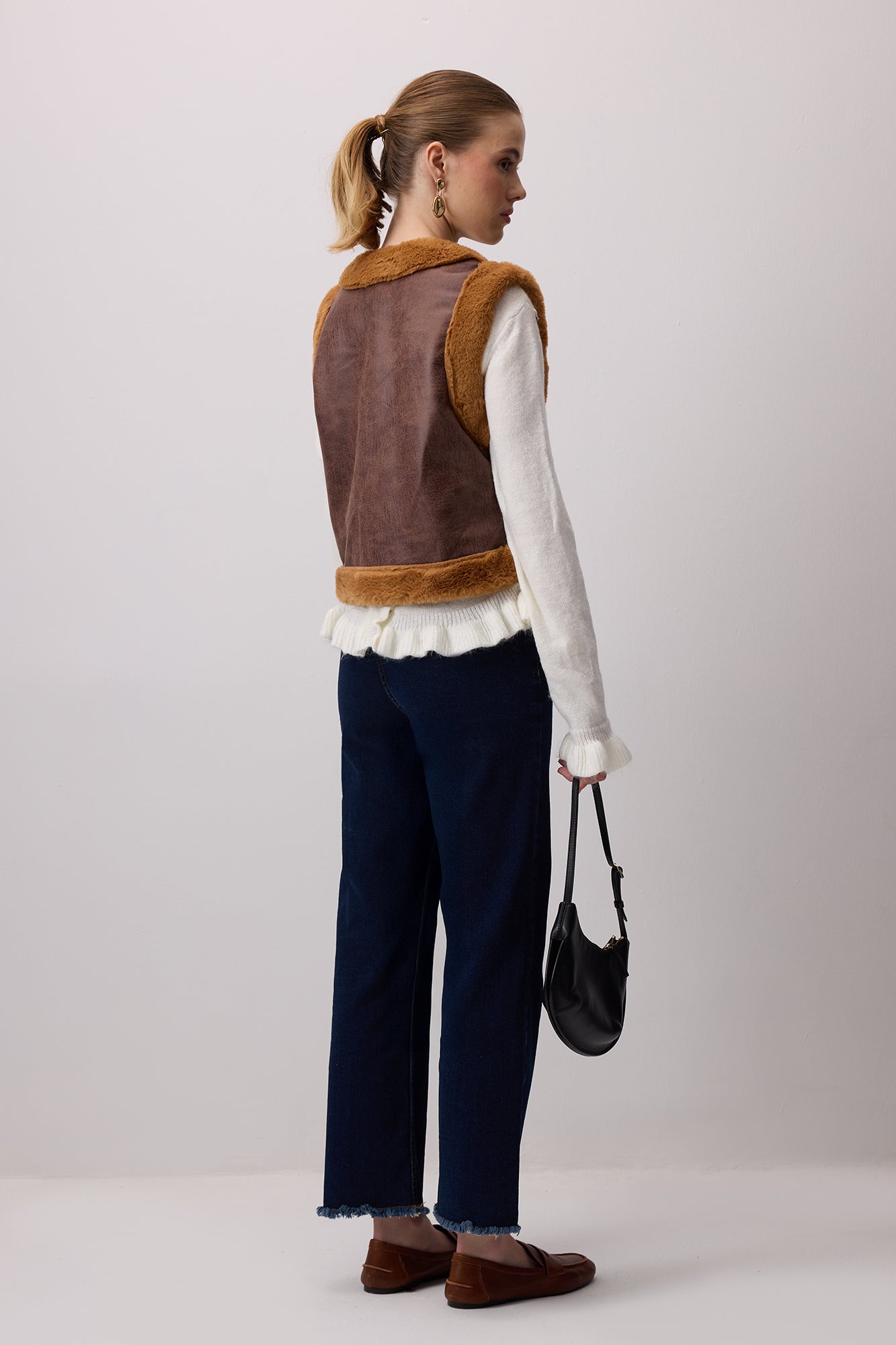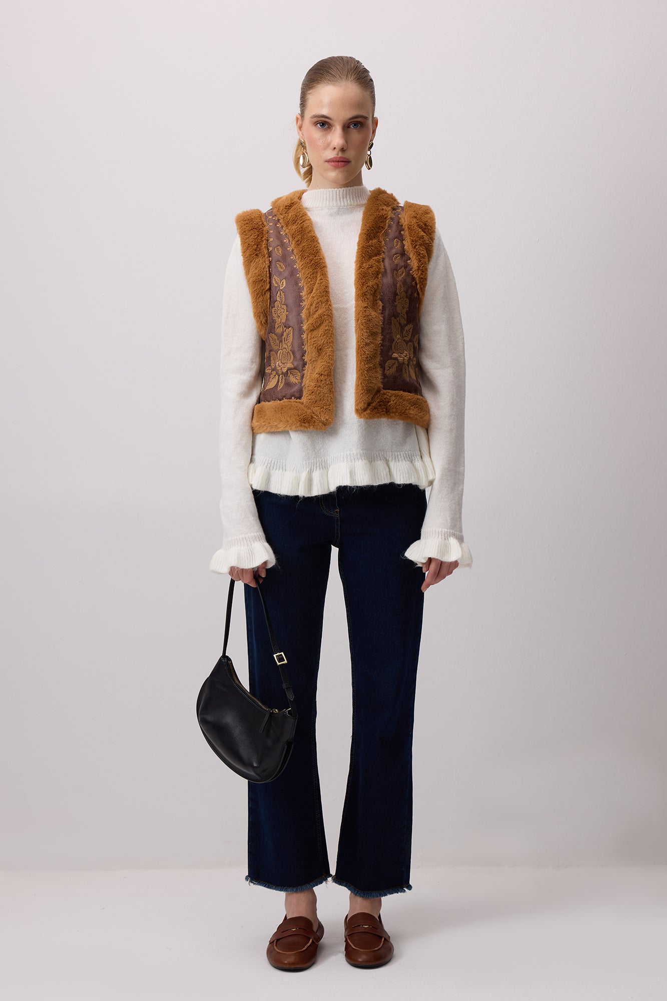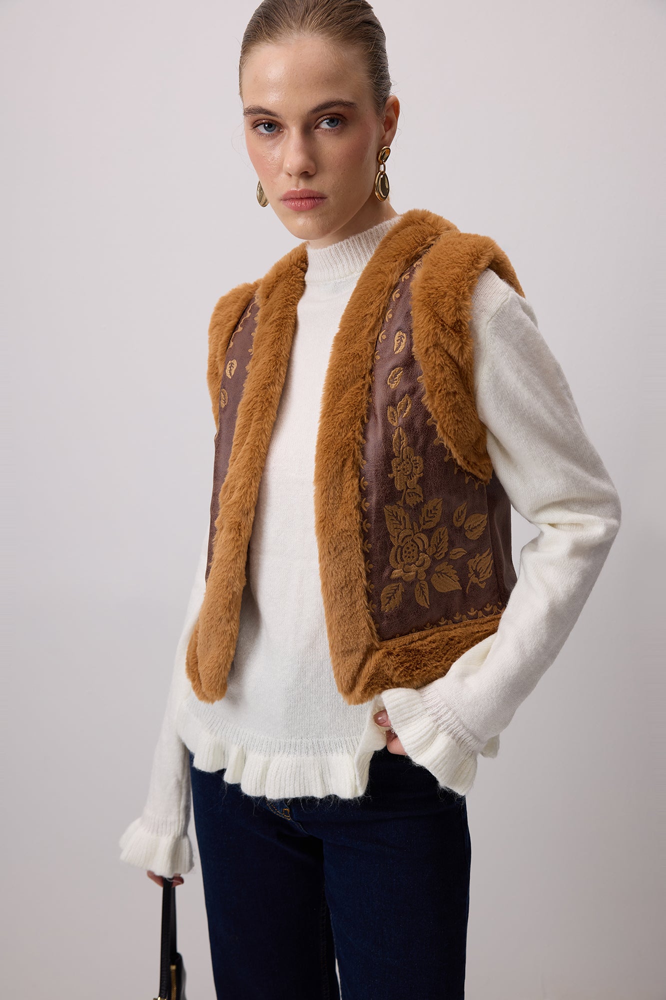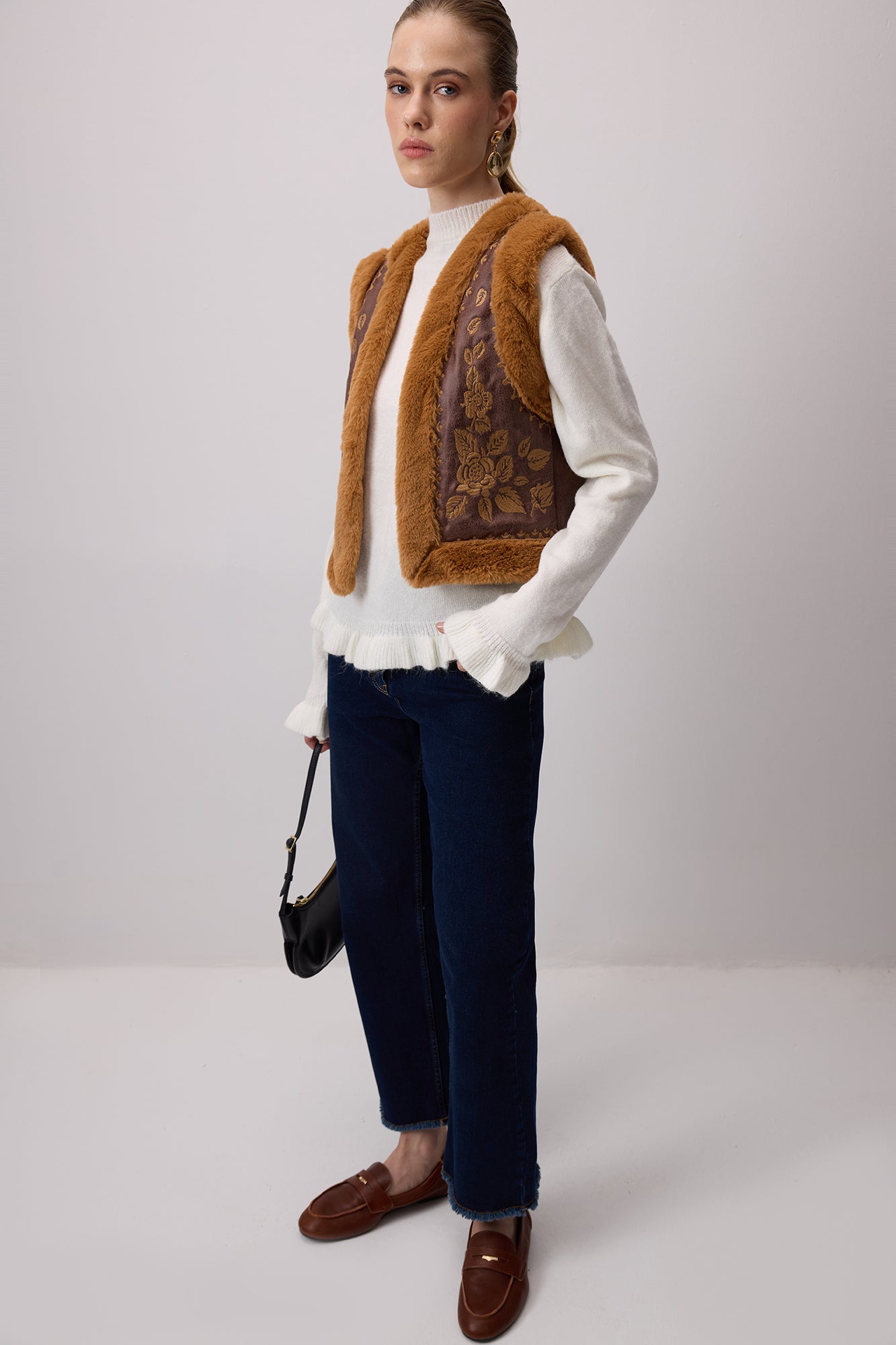 VEGAN DERİ NAKIŞLI KÜRKLÜ YELEK
